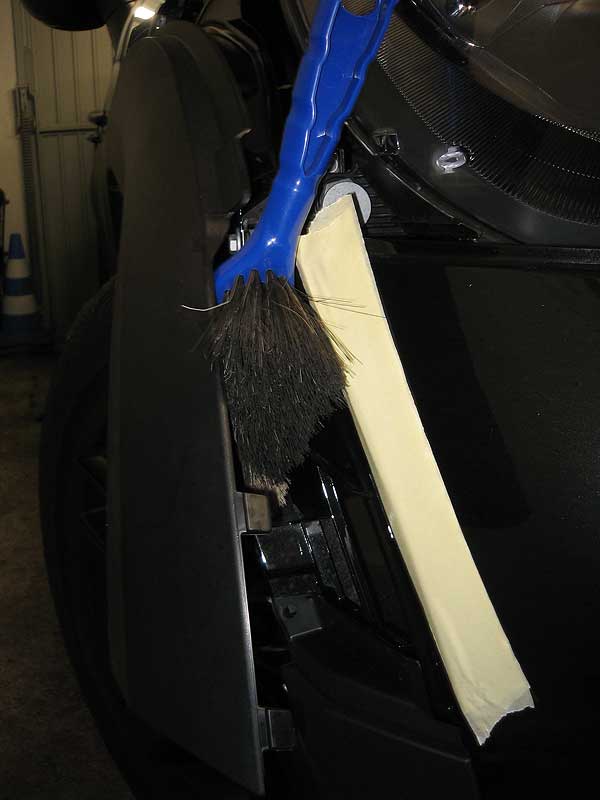 Vor dem nächsten Arbeitsschritt sollte man mittels dem Kreppklebeband den lackierten Bereich der Frontschürze seitlich zu dem Ansatz und der Kotflügelverkleidung abkleben um Kratzer zu vermeiden.