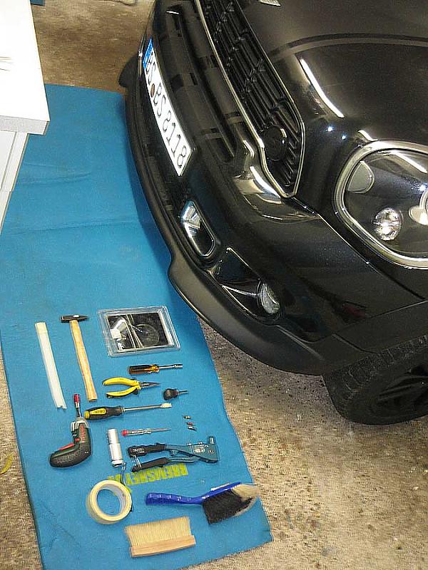 Die Stifte der Kunststoffnieten in den Kotflügelverkleidungen müssen später wieder eingesetzt werden. Das macht man am besten mit einem kleinen Hammer und einem flachen Stück Kunststoff oder Holz. Das verhindert Macken in der Verkleidung wenn man mal abrutschen sollte.