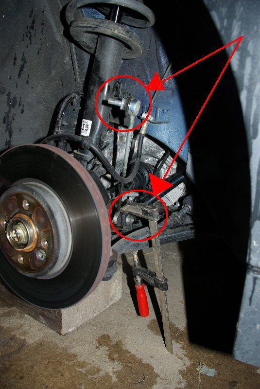 Jetzt ist die untere Verbindung zwischen Dämpfer und Achsschenkel dran. (18-er Ringschlüssel oder Steckschlüssel). Dabei den Achsschenkel mit (z.B. Holzklotz) abstützen, da dieser nach unten sinkt. [Nachtrag: Position des Dämpfers im Achsschenkel vorher mit einem dünne Filtzstift markieren!]