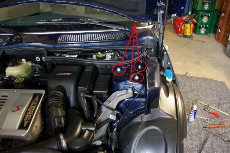 Der Ausbau ist nun fast geschafft. Es fehlen jetzt lediglich die 3 oberen Domlager-Muttern (13-er Ringschlüssel oder Steckschlüssel).