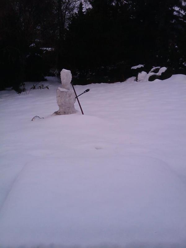 Bei uns sind nur noch 32cm Schnee, der ist aber auch bis zum Juni weggetaut. Auf dem Bild mal unser Schneemann und sein Zustand