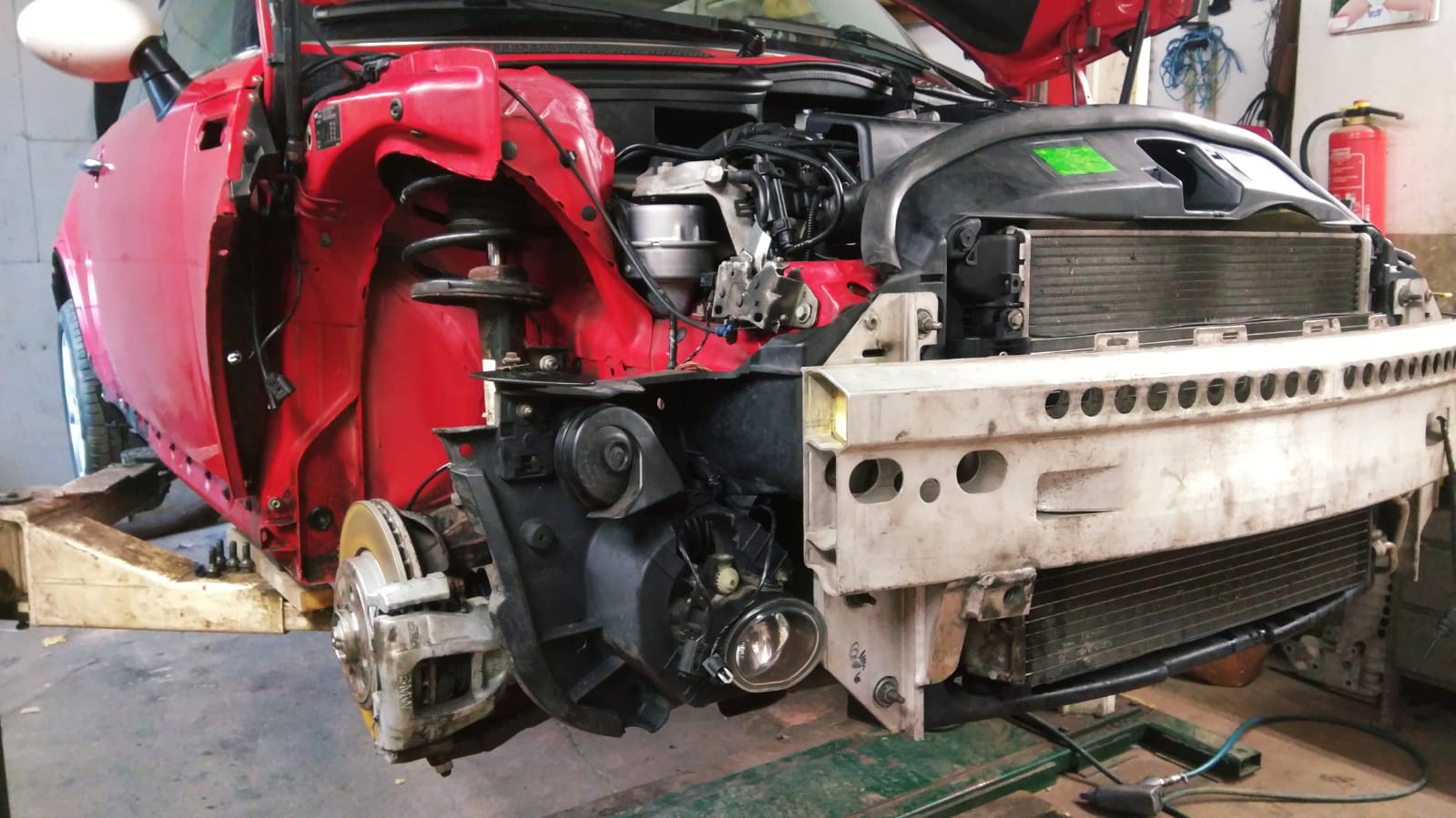 Kotflügel, Motorhaube, Scheinwerfer rechts, Stoßstange, Frontmaske (Plastikträger), Federbein mit Domlager, Radlagergehäuse