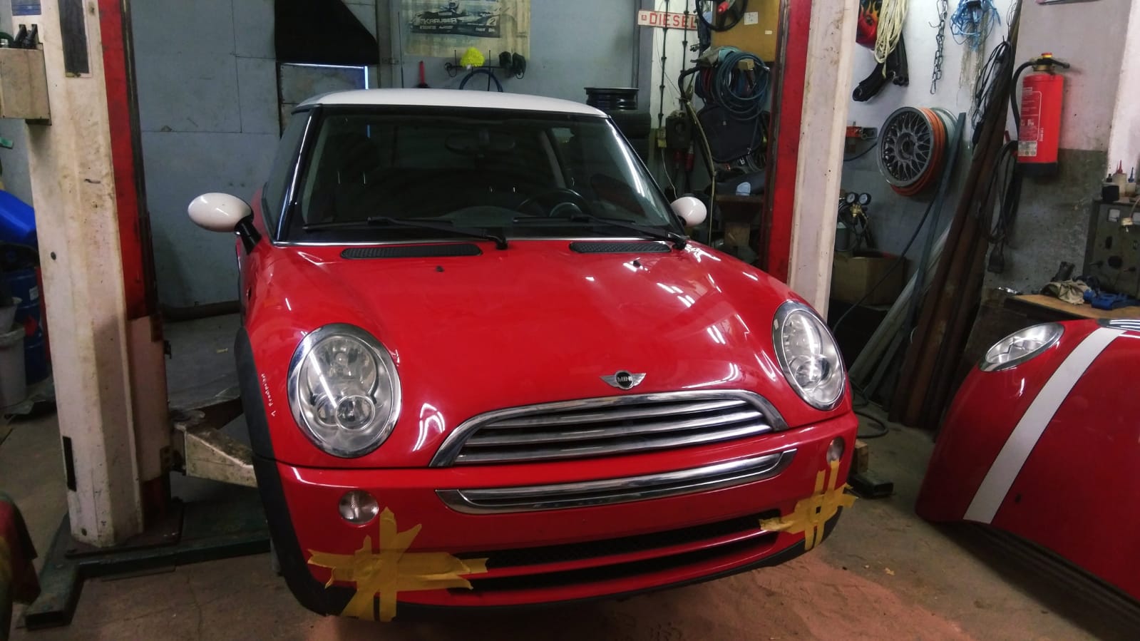 Dank meines Bruders und eines Freundes konnte der Mini von mir zu Hause in die Schrauberhalle befördert werden, wo auch mein Bruder gleich anfing sich ans Werk zu machen. Ich selber musste Urlaub nehmen und dann wurde der Mini wieder schick gemacht. Dabei galt das Motto: Nachher muss er technisch besser als vorher sein.