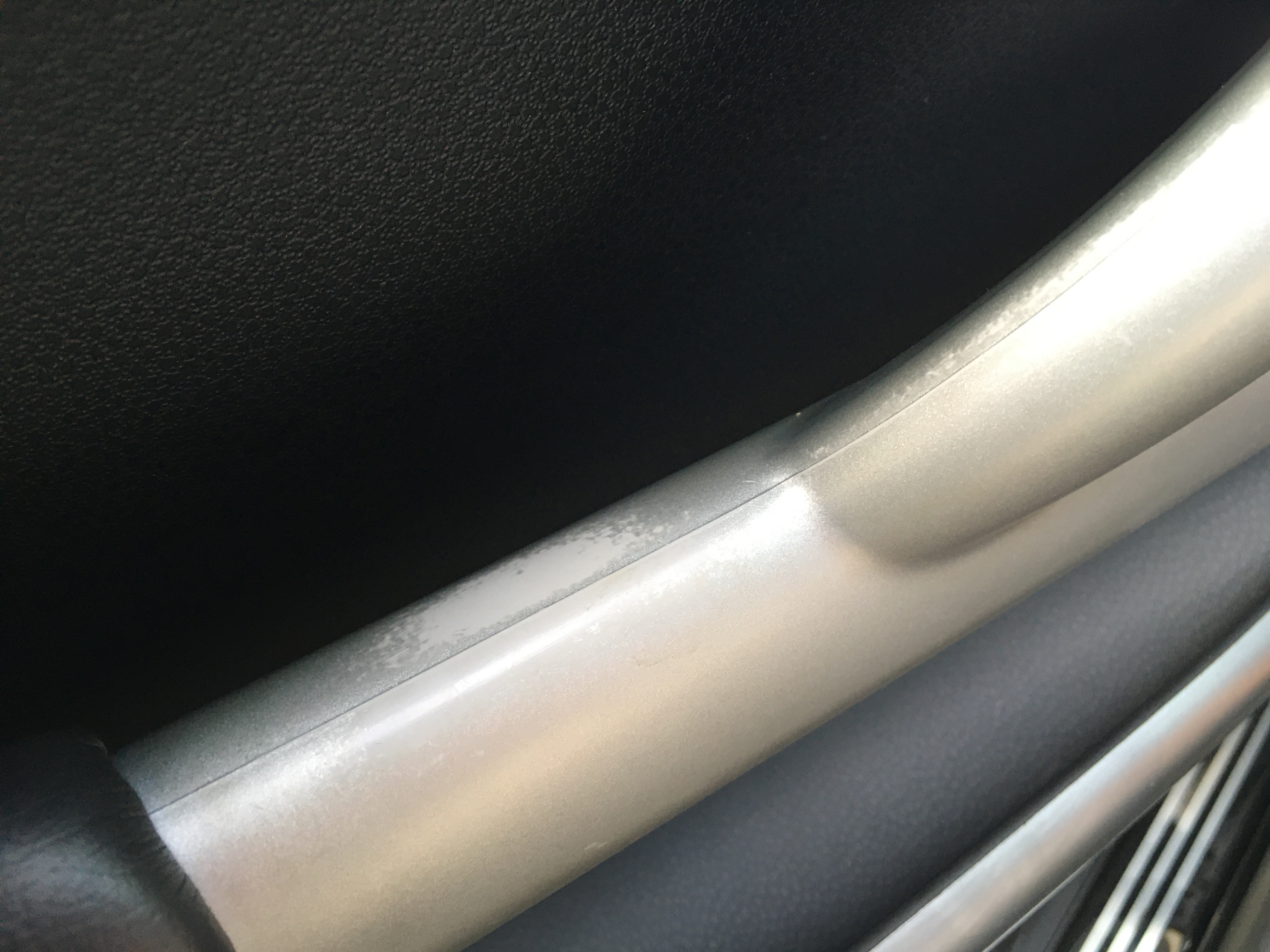 - Griffleiste Fahrertür lackieren. Die silberne Farbe der Griffleiste in der Fahrertürverkleidung hat sich mit der Zeit durch übertriebene Pflege (falsches Reinigungsmittel erwischt?) abgerieben.