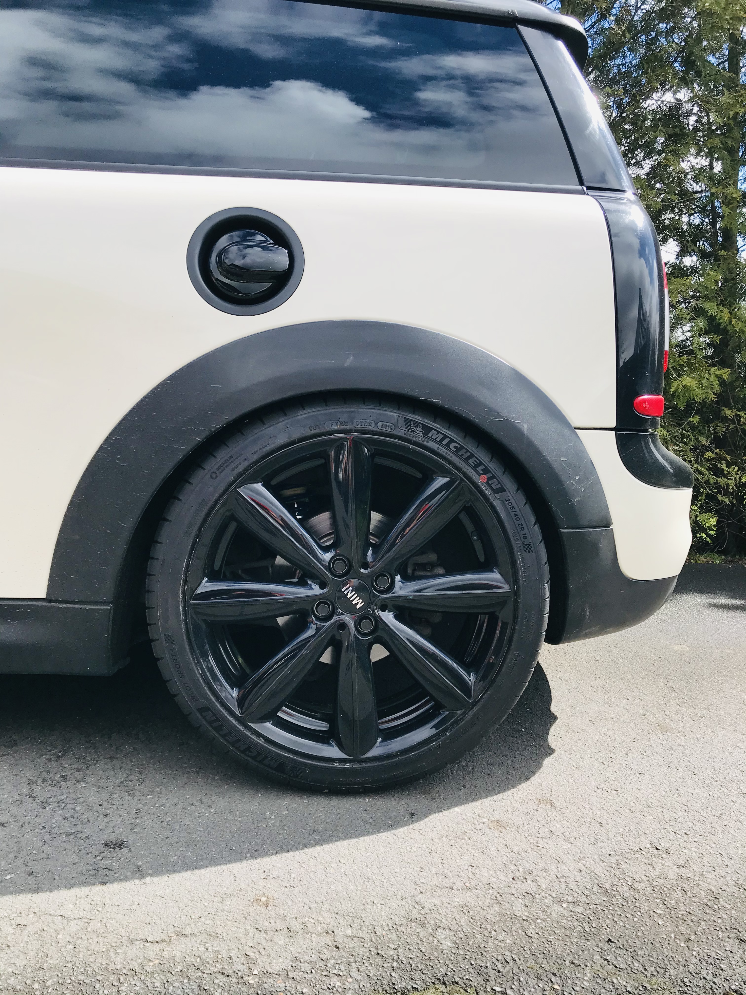 Gestern mal eben die 205/40R18 Michelin Reifen auf die Felgen gezogen, das Gewindefahrwerk mit neuen Domlagern verbaut. Die 10mm Platten harmonieren sehr gut.