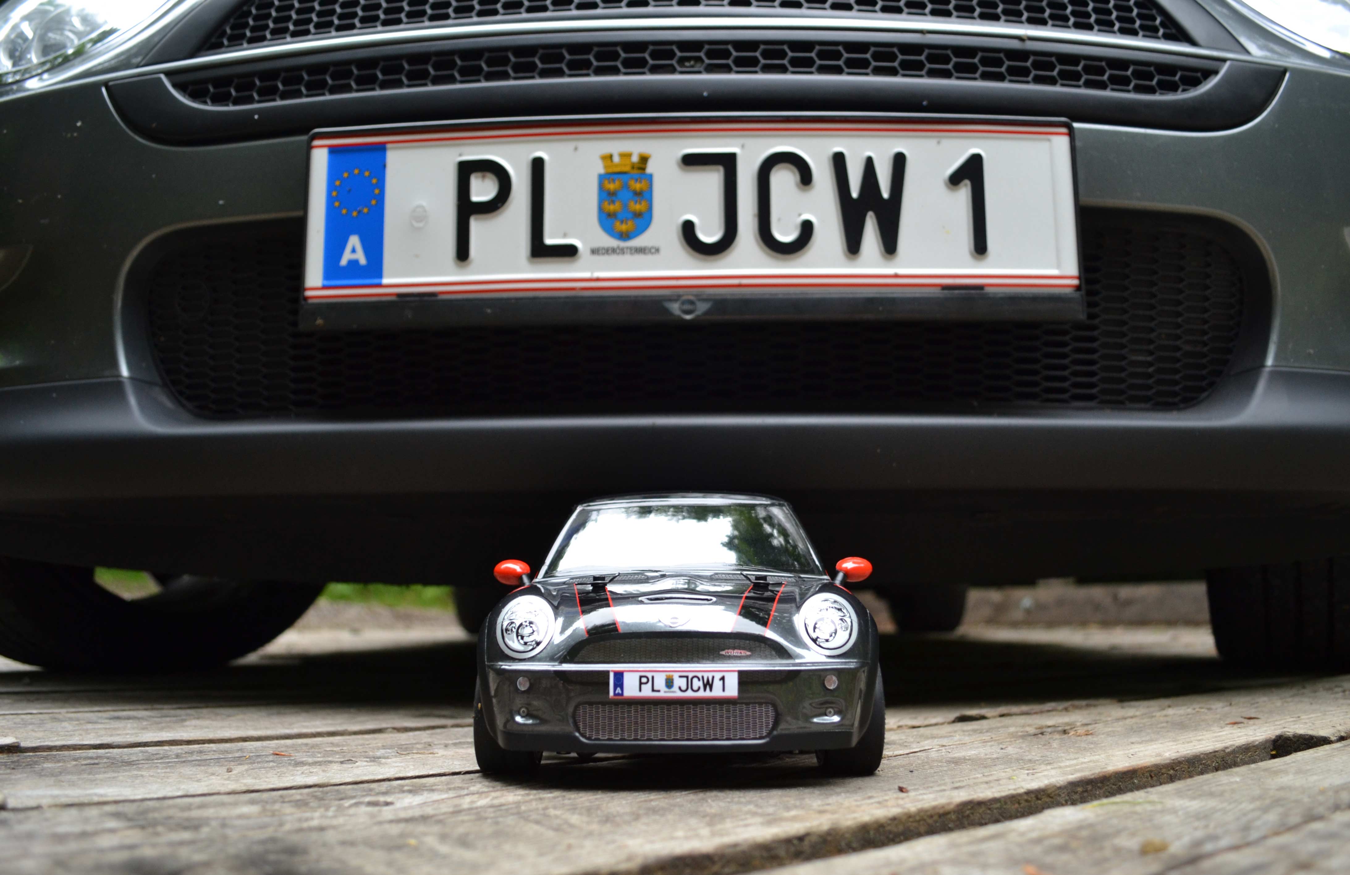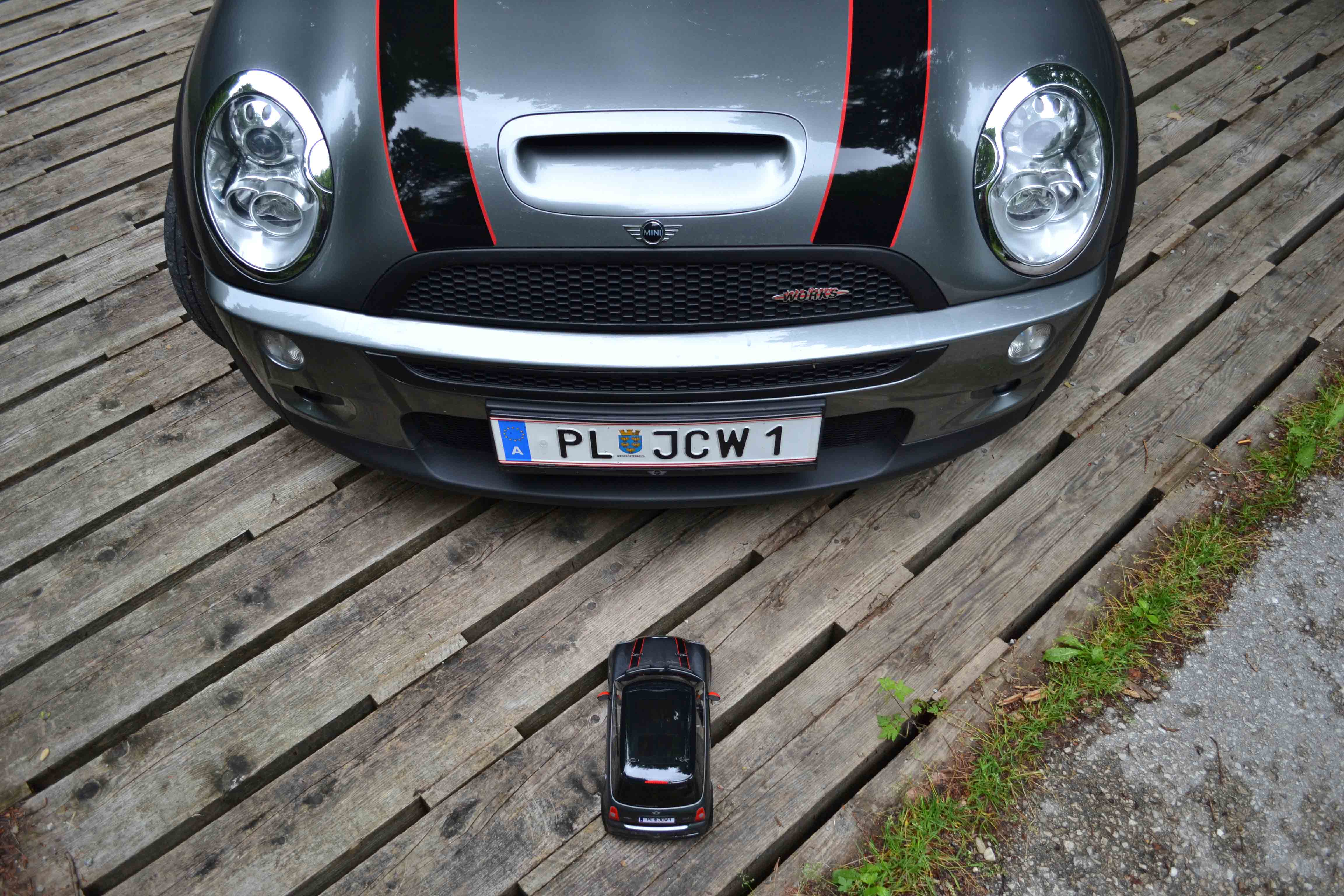 Jedenfalls konnte ich mein Vorhaben umsetzen und ging es immer langsam an, brachte die nötige Geduld auf, gab mich mit dem Erreichten zufrieden und sammelte Erfahrungen. Für das dritte Modell, einen Datsun 240Z, habe ich die Farben "Gun Metal Grey" mit Metallic-Effekt und Schwarz vorgesehen. Als ich dessen Karosserie lackierte, was in mehreren Durchgängen mit jeweils leichten Farbnebeln erfolgen sollte, und die Schichten des Gun Metal Grey sich immer mehr zu der tatsächlichen Brillanz der Farbe entwickelten, dachte ich nur: „Das sieht ja dem Dark Silver ziemlich ähnlich!“ eek! , gefolgt von: „die SPEEDMAUS als Modellauto …“ Liebe . Nach Fertigstellung dieses Lackiervorgangs setzte ich den Gedanken in Recherche um. Ich bin schon früher über den Bausatz des MINI Cooper R50 gestoßen, allerdings kam mir da nicht die Idee eine SPEEDMAUS daraus zu machen. Einerseits wohl aus dem Grund, dass die Optik der Front- und Heckschürze sowie der Motorhaube nicht passen und andererseits, weil es den Kit nicht mehr gibt. Auch die Karosserie als Ersatzteil ist nicht mehr erhältlich, ebenso die Aufkleber. Einen MINI Cooper S hat Tamiya 2007 auf den Markt gebracht, jedoch dann bereits als R56 - ebenfalls nicht mehr erhältlich. 2012 folgte noch ein Works R58 - gibt es derzeit noch bei einem deutschen Händler. Also nichts Passendes dabei bzw. erhältlich Cry . Ich gab aber nicht auf und fand in Good Old Britain einen Internet-Shop, welcher eine R53-Lexankarosserie in seinem Angebot hatte. Rasch noch gecheckt, ob der Radstand mit einem Tamiya-Chassis kompatibel ist (es sollte das frontangetriebene M-05-Chassis werden) und daraufhin den nackten R53-Body samt Aufklebern in den digitalen Warenkorb gelegt. Als einige Wochen später das Paket endlich eintraf, gleich die Ernüchterung über die Qualität der Aufkleber Püh! . Nicht nur die Optik ließ den bei Tamiya realistischen Detailreichtum vermissen, auch die Materialqualität versprach keine zufriedenstellende Verarbeitung. Was soll man sich bei 5 Pfund auch erwarten Ratlos . Jedenfalls, ohne ordentliche Aufkleber, kein MINI-Modell. Und wieder zog es mich ins Internet. Ich holte mir mehr Informationen zum R50-Modell ein, respektive zu dessen Radstand, welcher sich glücklicherweise als gleich zu meiner R53-Karosserie herausstellte. Somit könnte ich mit den R50-Aufklebern zumindest einen Großteil abdecken. Über die S-spezifischen Dekorelemente machte ich mir da noch keinen Kopf, da die R50-Aufkleber ja weiterhin nicht erhältlich waren. So verging einige Zeit, in welcher ich ein paar weitere Bausätze fertigstellte und auch für Bastelnachschub sorgte. Zwischendurch konnte ich die R50-Außenspiegel als Ersatzteil beschaffen und ebenso einen Felgensatz ausfindig machen, welcher dem Design der echten Speedmaus-Felgen ähnlich sah - 10 Speichen, Silber. Ich begann dann auch mit der Bau der kleinen SPEEDMAUS und bereitete das Chassis und die Karosserie so weit vor, als dass dann nur noch die Lackierung und Beklebung zur Fertigstellung fehlte. Wieder verging einige Zeit und ich klopfte mal wieder die Teilenummer der R50-Decals ins Netz, als eines Tages ein Angebot bei ebay-Kleinanzeigen auftauchte. Da bot doch tatsächlicher jemand einen neuen, vollständigen und originalverpackten Aufklebersatz an. Ich schlug sofort zu und hielt ein paar Tage später ein weiteres Puzzleteil für das Projekt in meinen Händen. Als ich den Dekorbogen zur unlackierten Karosserie hielt, um meine Fantasie über das fertige Modell zu beflügeln, bekam ich Zweifel, ob die Aufkleber passen würden. Denn für mich sah es so aus, als ob einige Aufkleber unpassend für die Karosserie wären. Die Scheinwerfer oder auch die Heckleuchten beispielsweise kamen mir viel zu groß vor. Trotz gleichem Radstand, keimte in mir der Verdacht, dass die Tamiya-Karosserie und meine aus dem Drittanbieter-Segment, möglicherweise unterschiedliche Proportionen aufwiesen. Bei der durchsichtigen Rohkarosserie war das nur schwer einzuschätzen. Ich ließ mich jedoch nicht entmutigen, denn bald sollten sich diese Sorgen als unberechtigt herausstellen. Ich schnitt einige Aufkleber aus, damit ich Anhaltspunkte für die notwendige Maskierung der Karosserie hatte. Dabei konnte ich feststellen, dass die Karossen wohl doch nicht so unterschiedlich sind, wie befürchtet Daumen hoch . Das vorbereiten der Lackierung verlangte einige Zeit, denn zuerst kam Gun Metal Grey dran, danach die schwarz zu färbenden Elemente und am Schluss die getönten Scheiben. Das Glas-Panoramadach sollte natürlich auch erkennbar sein. Die letzte Lackmaßnahme bestand darin, die umlaufenden Kunststoffblenden, als solches auch beim Modell aussehen zu lassen. Zu diesem Zweck wurden diese Bereiche von außen mit einem matten Klarlack überzogen, damit das Schwarz nicht so glänzt wie das lackierte Dach. Der Kleine sah seinem großen Pendant nun schon ziemlich ähnlich. Sodann konnte das Bekleben beginnen. Mit der bei den vorangegangenen Bausätzen aufgebauten Übung gelang das schon ziemlich gut, aber verklebt mal schwarze Aufkleber auf eine schwarze, Licht spiegelnde Oberfläche genau dorthin wo sie auch hin sollen. Zwei ruhige Hände (öfters auch eine dritte) und uneingeschränkte Sehstärke wären von Vorteil um auch die teilweise nur millimetergroßen Aufkleber präzise anzubringen Granpa . Die Schlüsselstellen waren dennoch die Scheinwerfer und Heckleuchten, da diese Aufkleber recht großflächig sind und die vorgesehenen Stellen eher kugelförmig geformt sind. Mit viel Geduld, einem extra angeschafftem Föhn (für meine Haarpracht bräuchte ich sowas ja nicht), Wattestäbchen, runden Zahnhölzern und einer fast schon zwanghaften Wiederholung der Arbeitsschritte, konnte den Aufklebern die Widerspenstigkeit immer mehr ausgetrieben werden, bis sie sie sich den Rundungen anstandslos anpassten. Für die R53- bzw. Speedmaus-spezifischen Aufkleber musste ich mir noch etwas einfallen lassen. Ich habe mit bedruckbaren durch