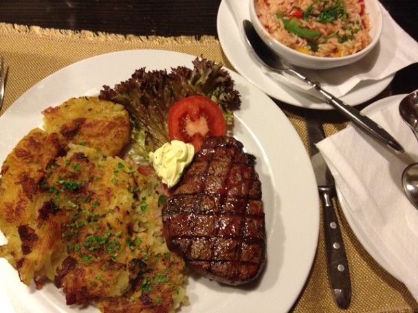Die Auswahl in der Karte war schwierig, wir tendierten dazu, einfach auf die Kuh zu zeigen. Schlussendlich waren wir jedoch vom Fleisch überwältigt und von der Zubereitungsart der Beilagen etwas überrascht - hier gibt es original Zwiebelringe!