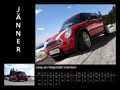 ) mir darüber Gedanken zu machen. Es sollte natürlich etwas mit dem Thema MINI zu tun haben (eh klar), günstig in der Anschaffung sein und einen möglichst langen Nutzen haben. Lange Zeit wollte mir nichts Passendes einfallen, doch Anfang November hatte ich plötzlich die Idee: Ein Kalender für 2008 sollte es werden. Bilder hatte ich zu Genüge, die Auswahl war eigentlich auch relativ bald erledigt und die Nutzungsdauer für ein ganzes Jahr war natürlich auch ein beeindruckendes Argument, aber dem standen natürlich die Produktionskosten gegenüber.