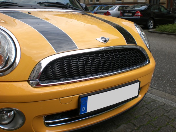In rot angedeutet habe ich den Verlauf des Cooper-Grills, zu dem vorher die Stoßstange gepasst hat. Mit dem Cooper S-Grill hat man also ein kleines schwarzes Eck, die etwas eckigere Chromleiste stößt auf die Stoßstange und der Übergang der oberen zur unteren Chromleiste passt nicht mehr genau.