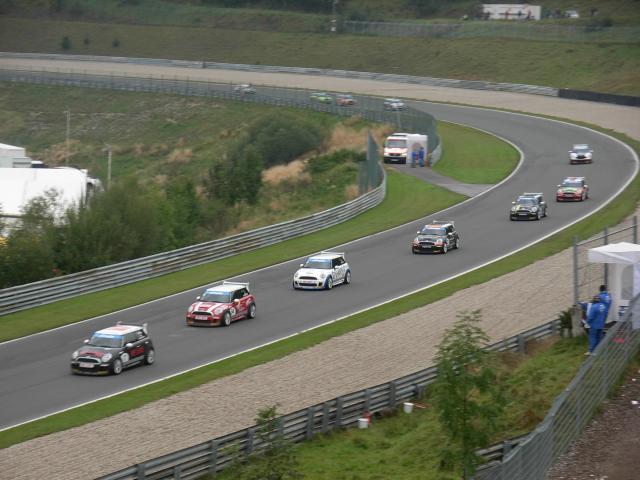 , habe ich mir eine Wochenendkarte besorgt, nachdem ich Coop am Fahrerlagerhügel geparkt habe. Am Infield-Parkplatz war zu dieser Zeit (16:25) so gut, wie gar nichts los. Lediglich ein Dark-silverner S mit Linzer Kennzeichen ist mir in Erinnerung geblieben, da er GP-Felgen montiert hatte. Im Fahrerlager traf ich dann dafür bigagsl, Dombo und Kopfhörer. Nach einem kurzen Pläuschchen machten wir uns auf den Weg, das Qualifikationsrennen zu sehen. Sie, mit ihren Presseausweisen