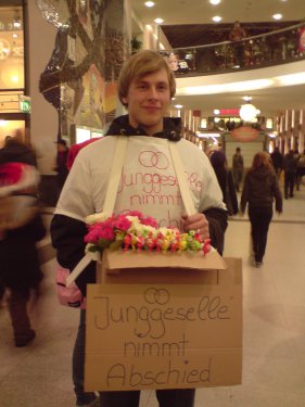 Hier mal ein Paar bilder von dem Junggesellenabschied.. kuckt mich an.. su musst ich rum laufen und des Zeug los werden.. - - Wollen du Rose kaufen?! *gg* (Hatte auch Pflümlies dabei.. die gingen am schnellsten weg)