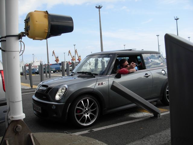 lag entlang unserer Spur, in die wir uns einordnen mussten, um dann Reihe für Reihe in den Bauch der Fähre zu fahren. Doch noch war es nicht soweit. Donald hatte viel Spaß mit einem vierfingrigen Handschuh und einem vermeintlichen Drogenspürhund namens Connor. Eric war auch schon ganz aufgeregt und freute sich auf seine erste Fährenfahrt.