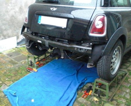 Der Durchmesser des Abgasrohrs beträgt beim One ca. 45mm. Beim MCS ca. 55mm. Also habe ich ein Reduzierungsstück besorgt und somit den MCS-Remus-ESD mit meinen MINI verbunden. Schellen drauf und fertig.