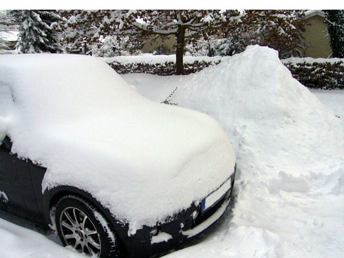 Man beachte die gekonnte Art, wie unser Hausmeister den Schneeberg auf die Fahrerseite meines Minis schüppt hat und mich damit zum Einstieg auf der Beifahrerseite zwingt