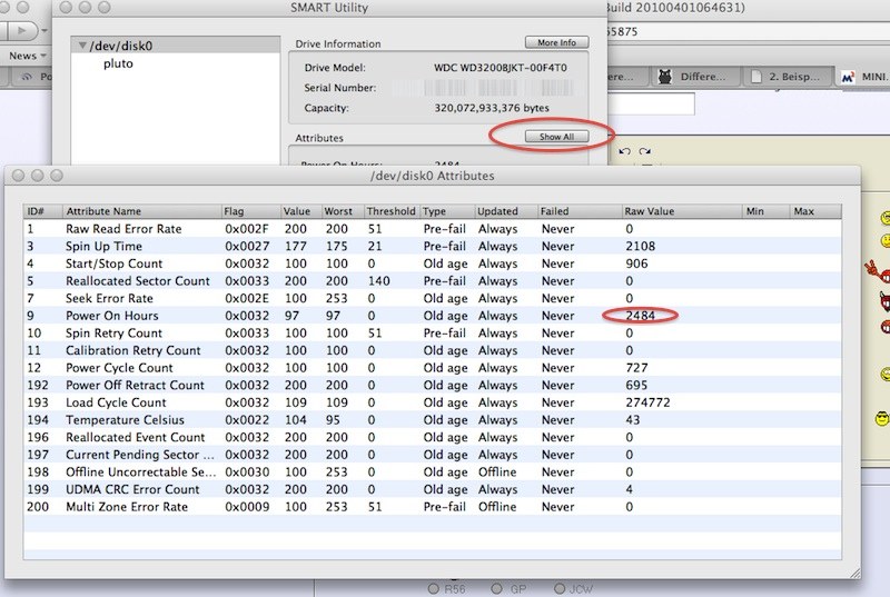 ... Soviele Möglichkeiten diese auszulesen gibt es nicht. Ich hab mich an den Betriebsstunden der Festplatte orientiert. Diese hab ich jedoch am 16.09.2009 ersetzt http://www.mini2.info/forum/showpost.php...stcount=94