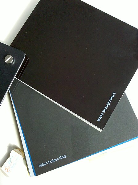 So, mein Händler hat mir netterweise mal den "Block" mit den Farbmustern vorbei bringen lassen. Ich hab mal ein Handyfoto vom Eclipse Grey im Vergleich zum Midnight Black gemacht. Sieht in der Sonne schon wie ein richtiges Grau aus. Lang nicht so dunkel wie im Konfigurator.