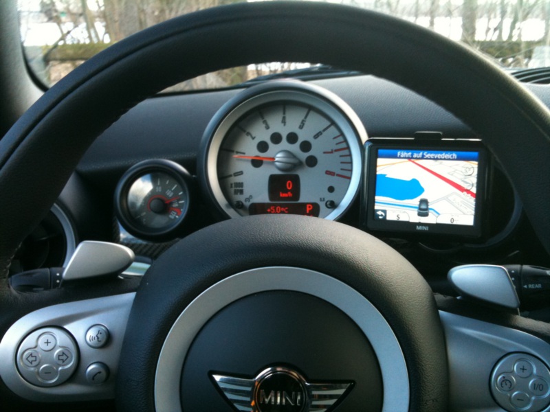 Der Halter, den Du auf dem Foto siehst hat unten 2 kleine Pins und oben ein länglichen Pin, welche in den dazu passenden Vertiefungen im Navi passen. Eingebaut sieht das Navi dann wie auf dem angehängten Foto aus.