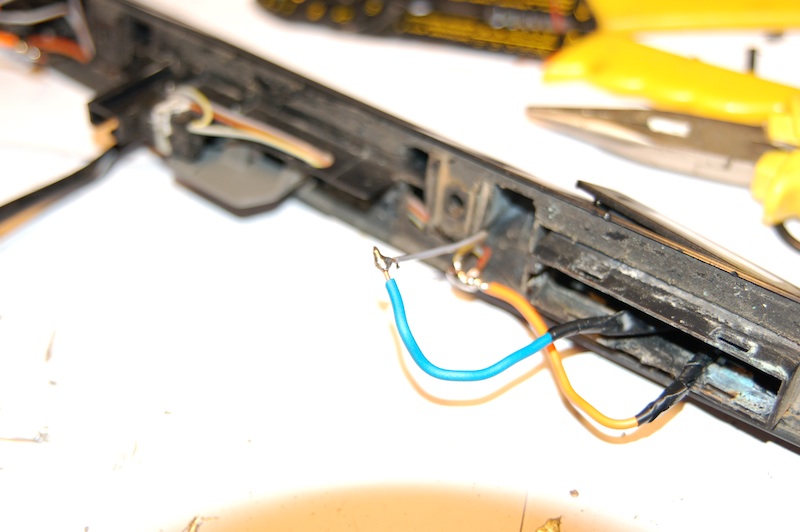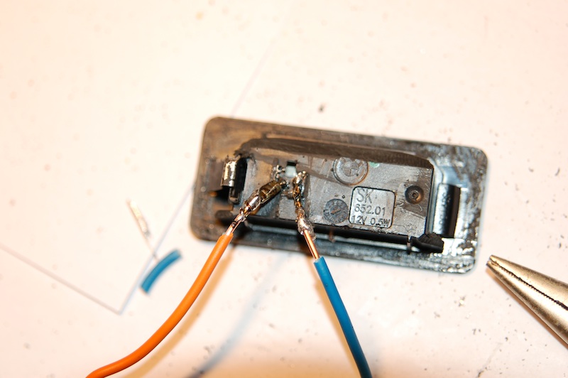 Kabel an die Pins vom bearbeiteten Led-Gehäuse gelötet: