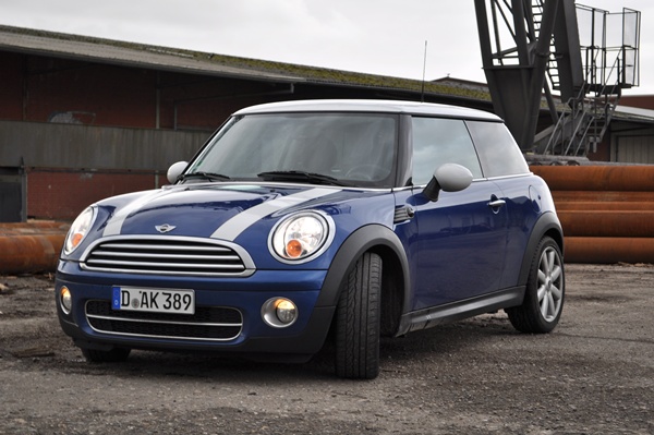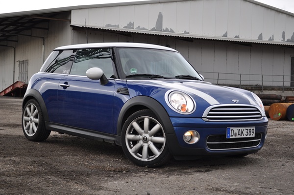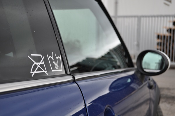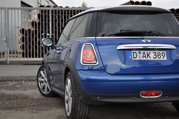 LED Tagfahrlicht, JCW Grill, schwarze LED-Nebelschlussleuchte, H&R Sportfedern 30/30, MINI Cooper SideStripes, weisse Bremssättel, JCW Carbonspoiler, weisse Rahmen um Front- & Heckleuchten