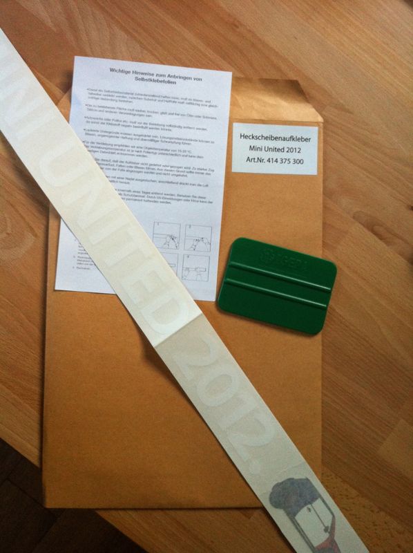 habe meinen MU-Sticker heute bei der Miniverkäufern meines Vertrauens abholen können. Der Sticker ist komplett, also nicht geviertelt, und auf einer Trägerfolie. Der kommt am Samstag drauf.