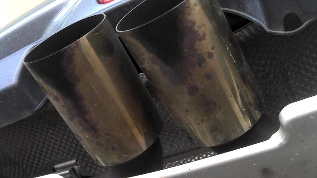 Auf dem Bild sieht man wie die Endrohre vor unserer Ausrichtung standen. Das linke ging noch - obwohl das auch nicht ganz mittig saß. Das rechte war sowas von schief...