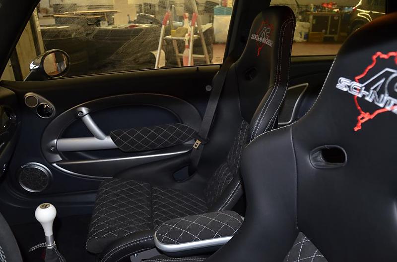 Danach war es um mich geschehen und mir war klar so ein Wagen muß her! Ich habe dann lange nach einem Cooper Works GP gesucht aber alles was ich mir angesehen habe hat einfach n icht meinen Vorstellungen entsprochen. Bis ich dann durch Zufall bei Mobile auf ein Inserat ohne Bild gestoßen bin, in dem ein Mini Cooper S R 53 von Schnitzer angeboten wurde. Ich habe den Wagen sofort reservieren lassen und bin dann 2 Tage später direkt nach Aachen gefahren und habe den Wagen dort zur Probe gefahren und sofort den Kaufvertrag unterschrieben. Das war genau das was ich gesucht hatte! Der kleine hatte vom Werk aus alles was man 2005 bestellen konnte und war dann von Schnitzer als Pressefahrzeug mit allem an Rennsporttechnik ausgestatten worden was Schnitzer zu der Zeit im Angebot hatte.