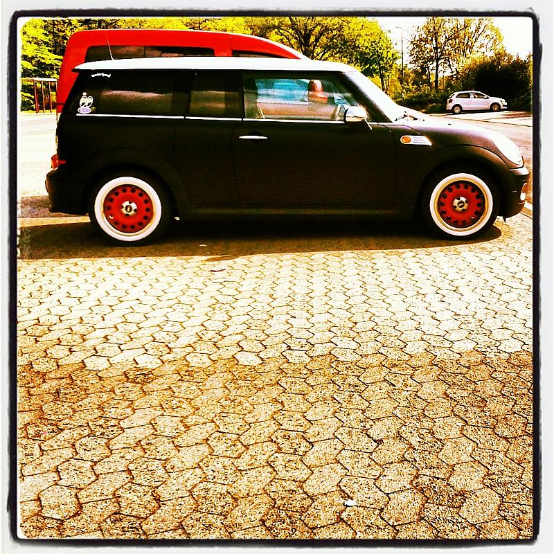 MINI Fan bin ich eigentlich schon seit der Grundschule, hängt wohl mit Mr. Bean zusammen, der damals sehr angesagt war an meiner Grundschule. Mein erstes Auto war trotzdem ein Renault Clio, der letztes Jahr dann sehr oft beim Freundlichen war, u.a. lief der des öfteren so voll mit Wasser, dass er anfing zu schimmeln von innen. Im November war klar entweder Grundsanieren oder neues Auto. Auf dem Weg zur Schule (Arbeit) komme ich öfters an einem Clubman vorbei und irgendwie verliebte ich mich in ihn. Eigentlich dachte ich, dass ich ein Leben lang auf den Classic MINI schwören werde, aber irgendwie ist es dann passiert. Ich begann ohne eine ernsthafte Absicht lose im Internet zu schauen, was der Gebrauchtwagenmarkt so her gab. Zwar hatte ich auf meinem Tagesgeldkonto ein gutes Sümmchen zusammen gespart, aber ein neuer war einfach nicht drin. Ich fand recht schnell einen, der in mein Budget passte. Einen Firmenwagen. Vorbesitzer war eine Tabak-Firma. Unsicher war ich mir trotzdem. Jeden Tag schaute ich mir die Anzeige an und stellte fest, dass der Preis sinkt. Kurz vor Weihnachten sagte ich mir, dass ich ihn mir ja mal anschauen könnte. Hingefahren, angeschaut, Probefahrt, Verliebt, Kaufvertrag. Clio noch für einen sehr guten Preis verkloppt und mir selbst das schönste Weihnachtsgeschenkt gemacht. Einen Haken hatte die Sache noch. Die Farbe gefiel mir einfach nicht so recht. Der Clubman, den ich selber gerne "Klubmann" nenne, war komplett schwarz. Da ich sehr gerne Rock und vorallem Rockabilly höre steh ich dem entsprechend auch auf Autos in diesem Look. Das ein Clubman kein '57 Chevy ist, war mir schon klar, aber in meinem Kopf hatte ich eine ganz klare Vorstellung und ich war mir sicher, dass das gut aussehen wird.