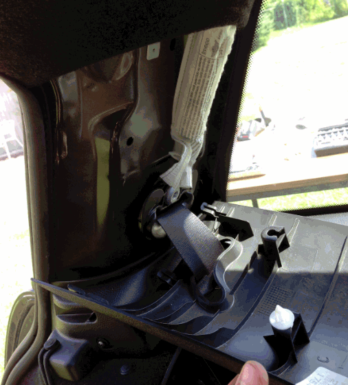 Im Grunde sind die drei Säulen ähnlich befestigt. Ihr müsst zuerst das AIRBAG Schild auf der Säule raus bringen. (Dazu einfach was spitzes nehmen. Ich hatte ein altes schmales Küchenmesser - hat super funktioniert, da man dirket unter die Abdeckung gekommen ist. Ansonsten ist hier das Risiko hoch etwas zu zerkratzen. Schaut euch die Bilder an - hier seht ihr welche Seite des AIRBAG Schilds zuerst gelöst werden muss. Danach die Torx Schraube darunter lösen. Jetzt die Säule zu euch ziehen (Ist nur geklipst). Dann die Säule nach oben raus nehmen, da unten wieder Halter dran sind.