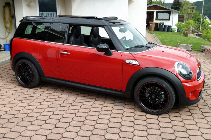 Wie schon gesagt, mussten direkt die 17 Zöller drauf. Außerdem ist der Schaltknüppel durch ein JCW-Teil ersetzt worden. Die Türöffner und der Knopf für´s Handschuhfach bekamen einen UnionJack-Design, um ein wenig Farbe in den Innenraum zu bringen. Zu guter letzt bekam das bewährte Garmin-Navi mittels Brodit-Halter einen Platz neben dem Tacho.