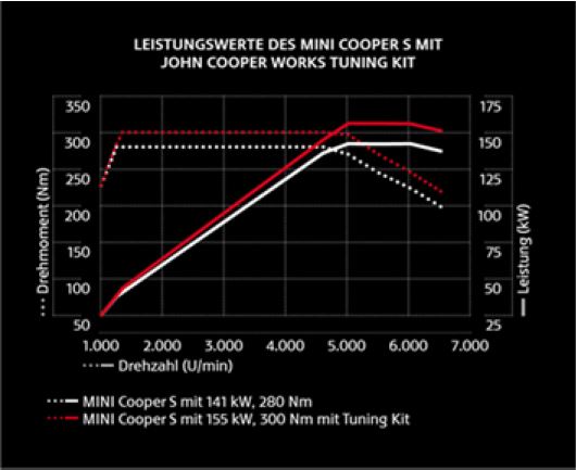 - Durch das JCW Tuningkit wird die Leistung des Serienmotors auf 155 kW gebracht. Eine Leistungssteigerung, die für Begeisterung sorgt.