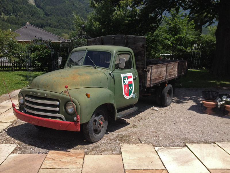 Trotz regnerischer Wetteraussichten haben wir keinen einzigen Regentropfen gesehen. Im Gegenteil, die Sonne war bei unserer kurvenreichen Anreise, unter anderem natürlich durch das Höllental, ein ständiger Begleiter. Kaum nennenswerter Verkehr hat den Kurvenrausch auch noch begünstigt. Im Schloss Wartholz angekommen wurden wir stilecht von diesem Vehikel in Empfang genommen: