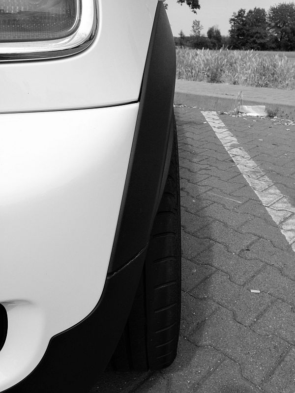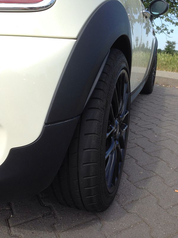 Jetzt zu meinem Problem: Ich fahre 30mm Spurplatten von H&R und weil ich damit nicht durch den TÜV gekommen bin, habe ich die kleinen Kotflügelverbreiterungen vom GP drauf gemacht - da waren die Reifen halb runter. Aber auch die Reifen schleifen genau an den Kotflügelverbreiterungen, wenn ich durch ne ordentliche Bodenwelle fahre. Bislang alles o.k. aber mit neuem Profil wird das natürlich heftiger werden.