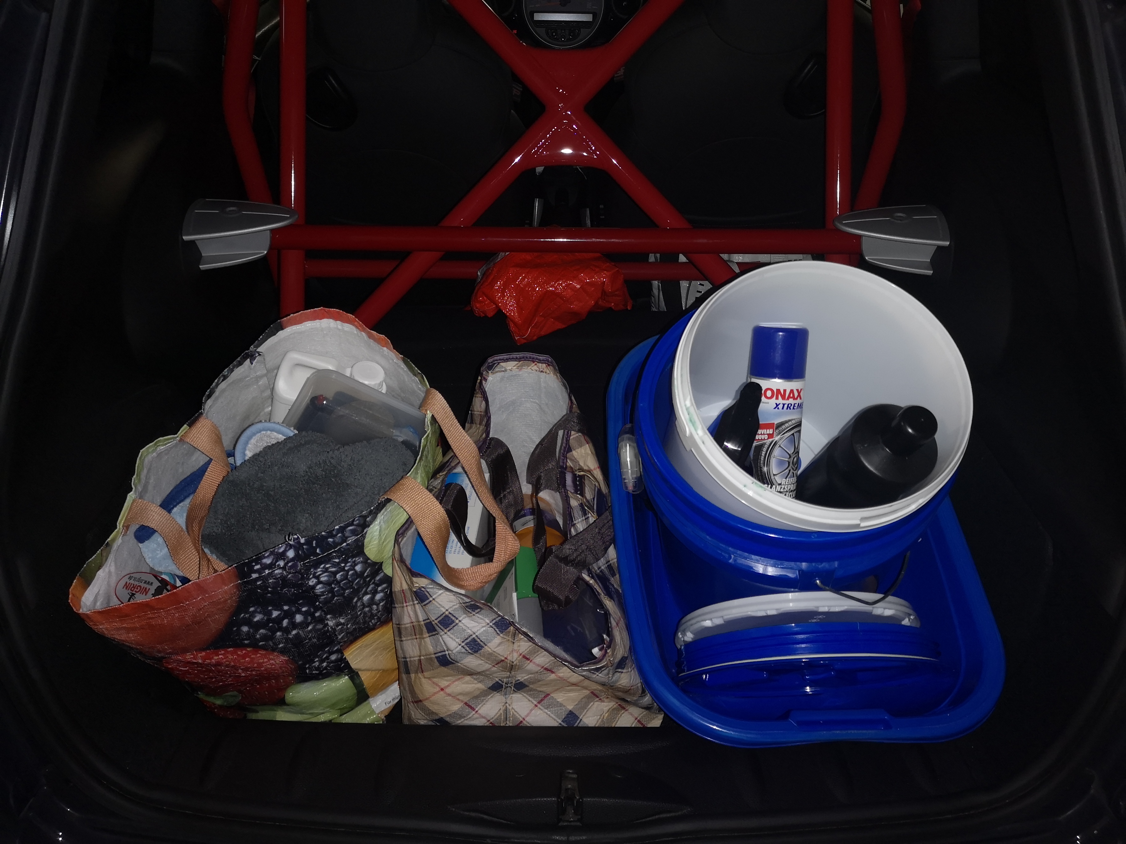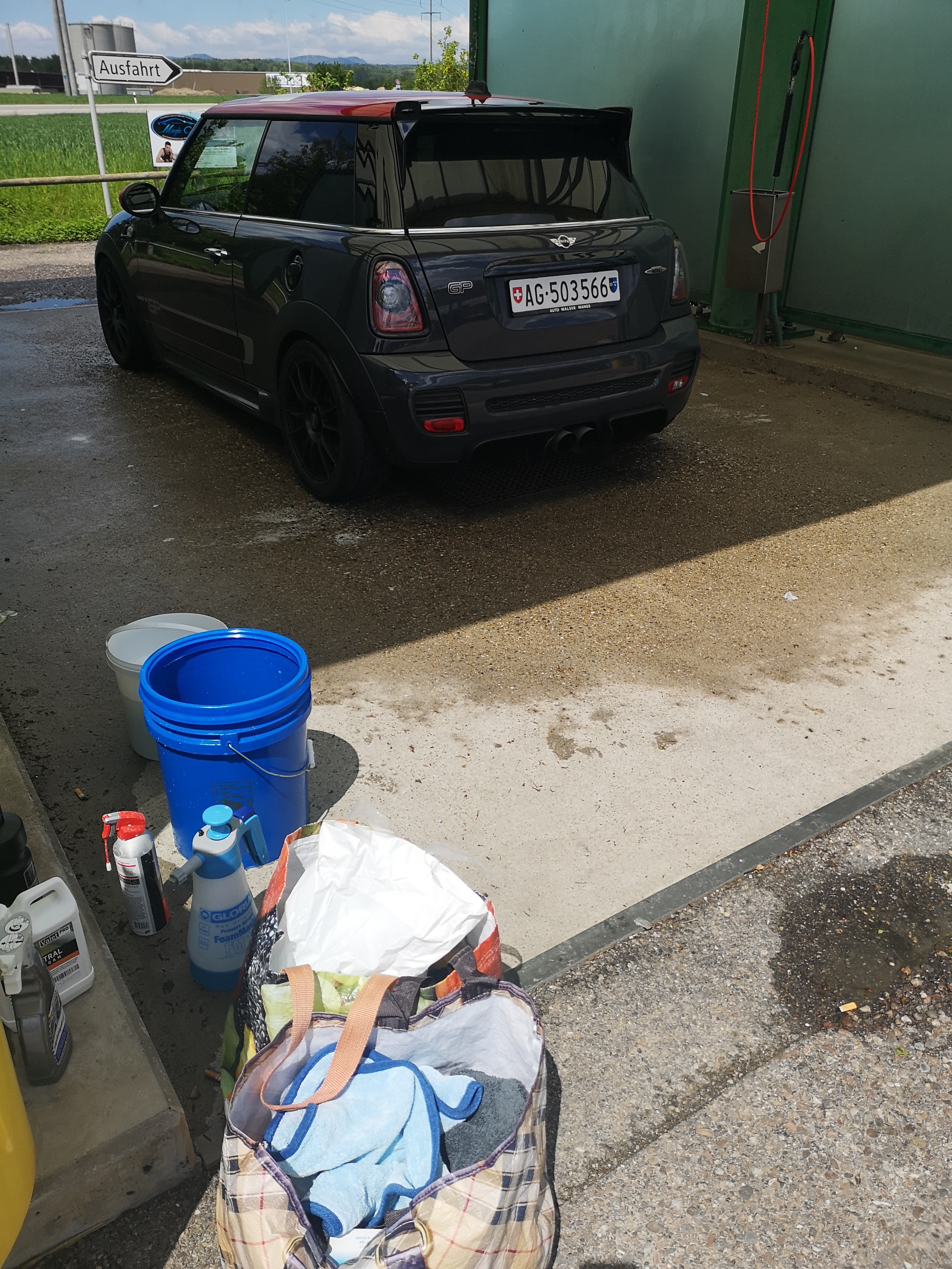 Dann durfte ich die ganze scheisse polieren. Habe das mit Gyeon Cure und Mikrofasertuch gemacht. Es war mühsam und hat gute 90min gedauert, bis es einigermassen wieder geglänzt hat. Dann noch mit Gyeon Cure die Kunststoffspoiler behandelt, Reifen mit Wichse eingesprüht, Endrohre poliert, innen mit Glassreiniger gereinigt die Fenster, die Oberflächen abgewischt und das war es dann. Zu Hause nochmal alles nachgewischt mit dem feuchten Mikrofasertuch, wo das Cure noch drauf war und abgestellt...