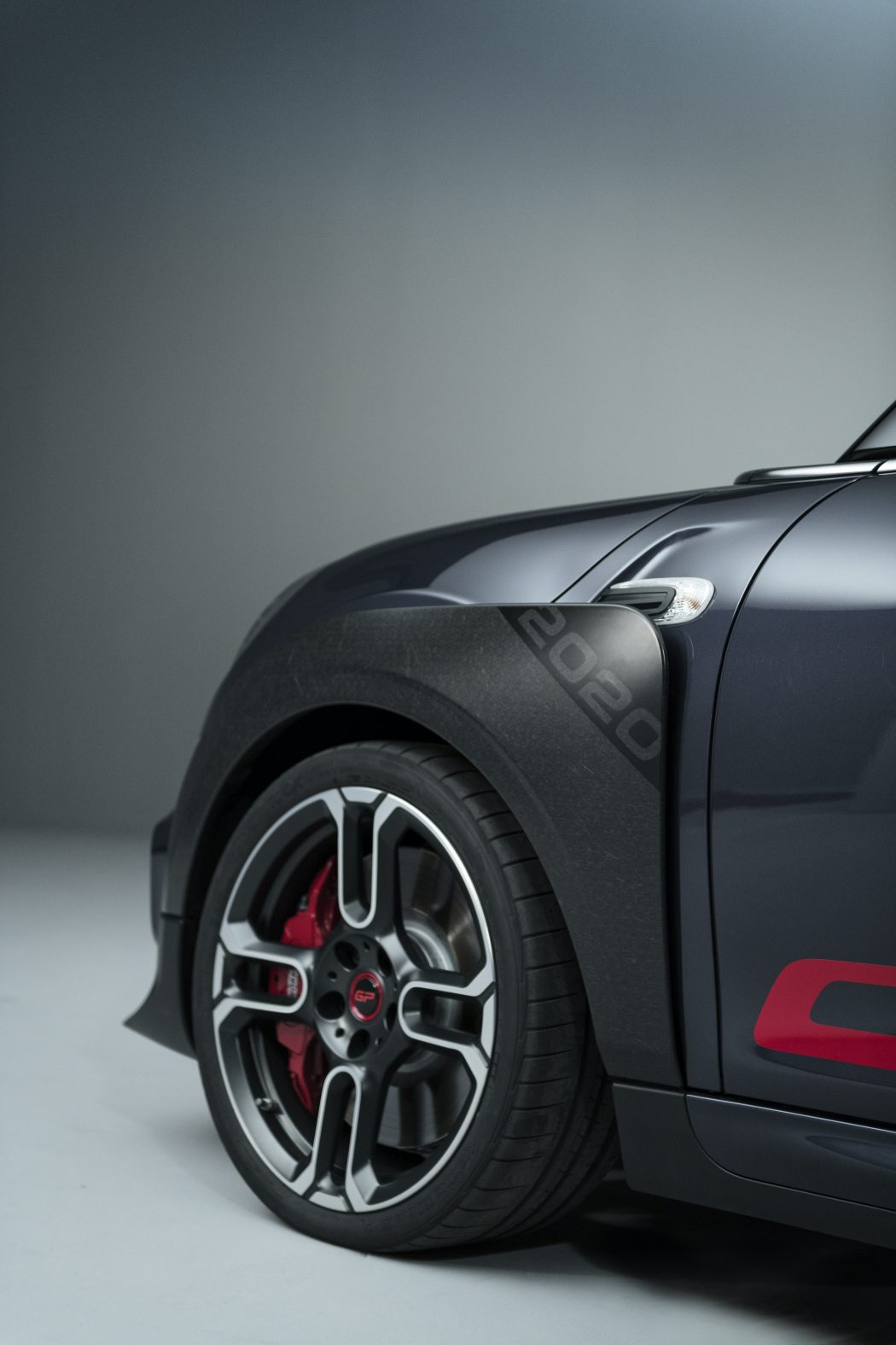 Bewusster MINImalismus in Form und Farbe stellt die Technik in den Fokus, hervorgehoben durch farbige Akzente in hochglänzendem Chili Red und mattem Rosso metallic. Der Einsatz von Leichtbaumaterialien wie Carbon optimiert das Leistungsgewicht, während die maximal optimierte Achslastverteilung MINI typisches Gokart-Feeling verspricht. Absolutes Highlight in der Seitenansicht sind die aufgesetzten Radlaufblenden, sogenannte Spats, aus Carbon. Aufwendig in Handarbeit gefertigt, kommt hier recyceltes Carbon-Vlies aus dem Werk Landshut zum Einsatz. Das Carbon-Gelege ist erstmals direkt sichtbar und durch schwarzes Hexagon-Stitching inszeniert. Die Nummerierung im vorderen Spat zeigt die jeweilige Produktionsnummer innerhalb der Kleinserie. Die 18‘‘ Leichtbau-Schmiederäder in Bi-Color-Ausführung interpretieren das prägnante Vierspeichenthema des MINI John Cooper Works GP auf filigrane Weise. Es ist das leichteste 18‘‘ Schmiederad, das es bei MINI je gab, wodurch es wesentlich zur Gewichtsreduzierung beiträgt.