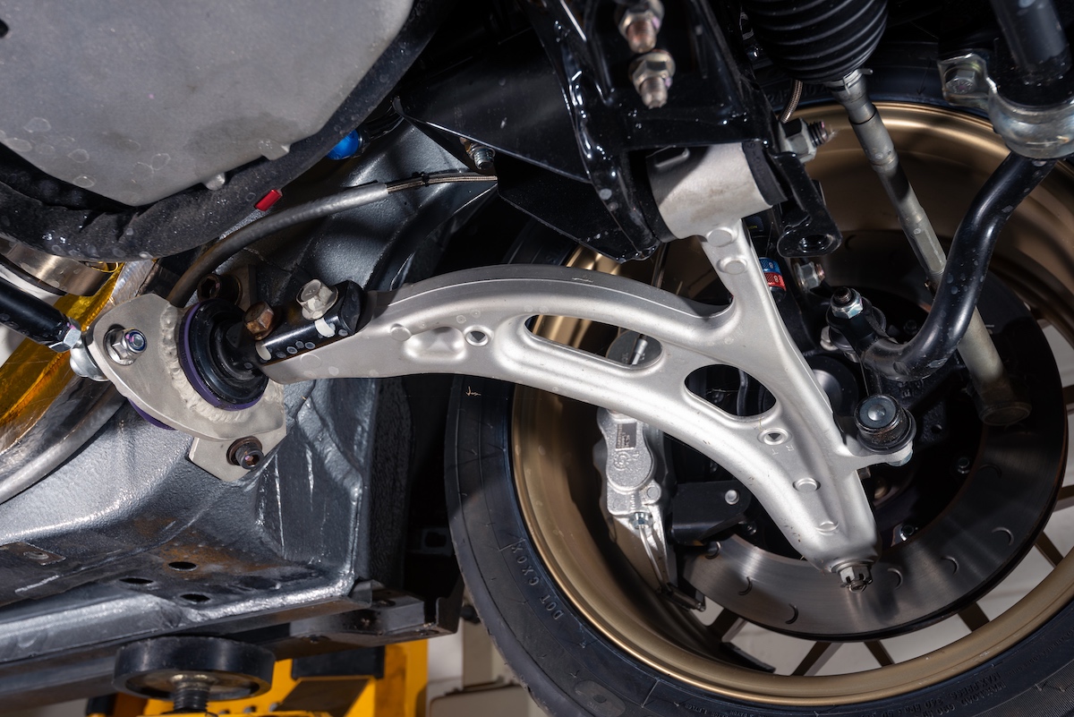 A key decision in the planning stage was to install the V-shaped and therefore relatively compact S65 motor, together with its seven-speed DCT transmission. Nevertheless, the complexity of engineering a longitudinal eight-cylinder powertrain into a chassis designed to accommodate a transverse four-cylinder set-up meant that the entire floor pan and bulkhead had to be strengthened and reworked. As a result, the engine and rear differential now sit on modified Subaru Impreza STi subframes - all mounted and mediated by Powerflex polyurethane bushes, of course - while the hubs are suspended from bespoke MacPherson struts secured within custom towers.