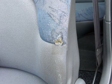 Unter dem Innenspiegel gibt's doch bestimmt überflüssigen Stoff! Den Kleber würde ich dann mit einer Spritze genau auf das Loch setzten und dann den Flicken drauf, sonst hast Du nachher einen Kleberfleck und das sieht genauso blöd aus.