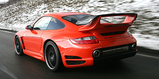 Net schön aber selten,... Schön dezent schmiegt sich das Gemballa-Emblem in die blutorangene Motorhaube des GTR 650 EVO auf Basis des Porsche 911 Carrera. Alles andere an dem 650 PS starken Boliden hat mit Understatement nichts mehr gemein. Soll es auch nicht. Denn in der Leonberger Sportwagenschmiede werden traditionsgemäß brave Serien-Porsche zu spektakulären Straßenexoten modifiziert.