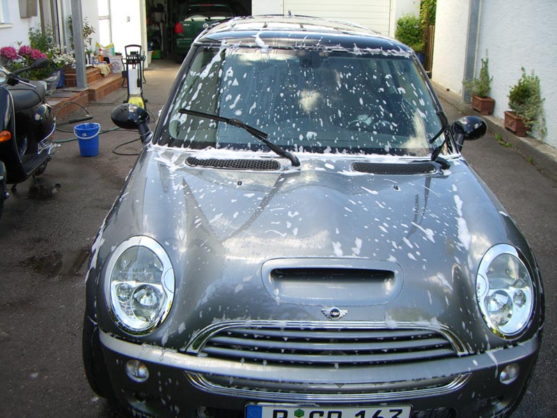 Meinen Kleinen in die Auffahrt gestellt, erstmal ordendlich einshampooniert und dann eben mal grob von außen gewaschen. Hierzu hab ich einfach ein stink normales Autoputzmittel von ATU genommen.