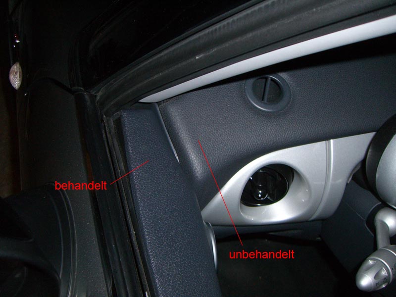 Bei meiner Bestellung von Petzoldts waren unter anderem auch 2 Fläschen Kunststoffreiniger, bzw. Pflege von Liquidglass dabei. Und da meine Plastikverkleidungen im Innenraum teilweise schon sehr dreckig waren (unter anderem eine extrem hartnäckige Ablagerung von "Schleifpaste" oder so vom BMW Onkel der meine Scheibe abgeschliffen hat um das quietschen der Gleichen zu beseitigen - übrigens ohne erfolg