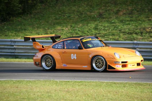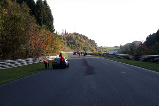 Mit etwas flauem Magen starteten wir zu unserem zweiten Stint, nur um noch haarsträubenderere Situationen zu erleben. Oder wie würdet Ihr es bezeichnen, wenn Ihr unter Aufbringung Eures ganzen Fahrkönnens mit 160 + X km/h die Fahrerlagerkurve durcheilt, den Anbremspunkt der anschließenden 180° Kurve noch gerade so erwischt und dann einlenken wollt, doch, oh Schreck, dort quetscht sich gerade ein orangefarbenes Monster in Form eines 600PS starken Porsche 993 GT2 mit Slicks an Euch vorbei... ohne Rücksicht auf Verluste, in einem freien Training.