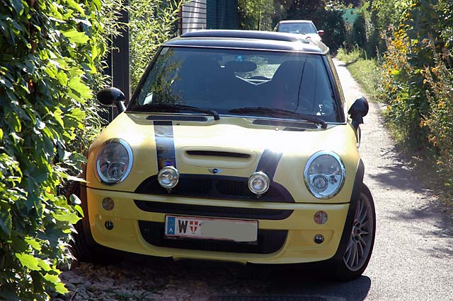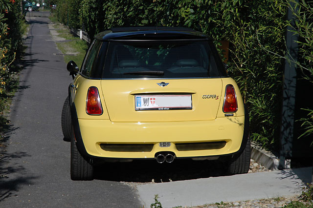 so, es ist vollbracht. ich habe einen leichten sonnestich um mein mini glänzt endlich mit dem aerokit. es hat etwas länger gedauert, zusatzscheinwerfer abmontieren, dann die unzähligen schrauben, dann wieder drauf, dann diese sch..... anleitung verbrannt, (habe zunächst die vorderen halterungen verkehrt montiert) dann kabelbinder statt diese blöde kunstschoffschrauben verwendet, ein wenig improvisationstalent, die mittlere halterung hinten war nicht dabei, da musste ich mir eine auf die schnelle machen, da wäre sogar meister rich stolz auf seinen lehrbua! seht selbst - mir gefällts