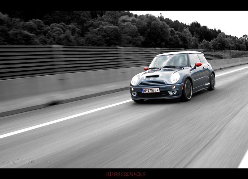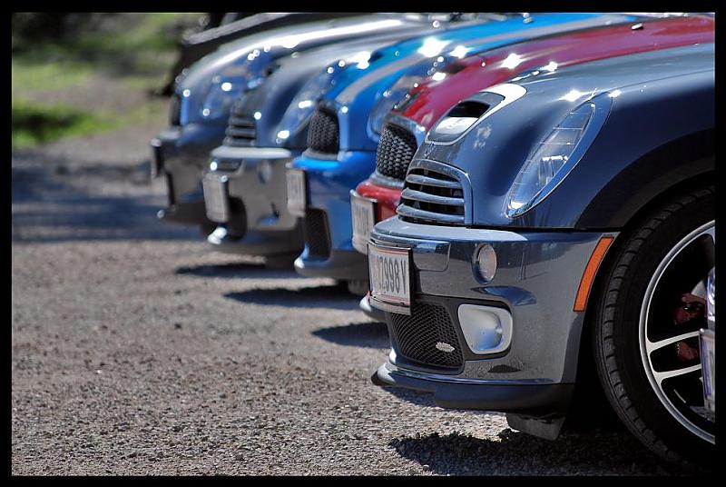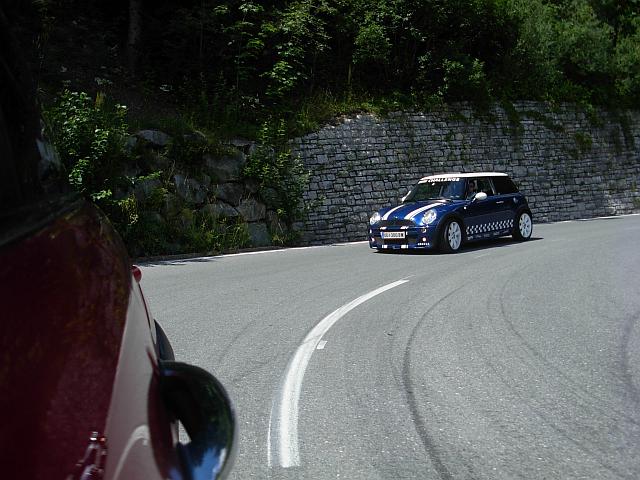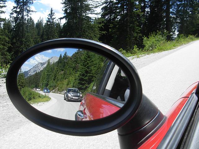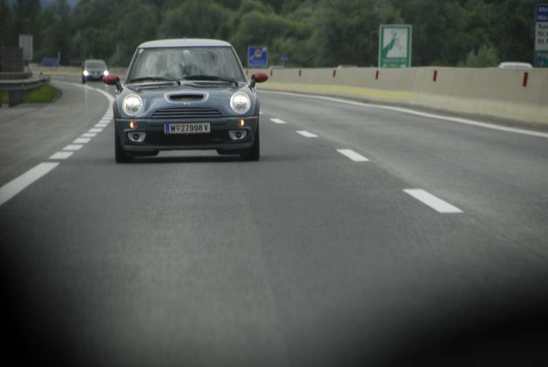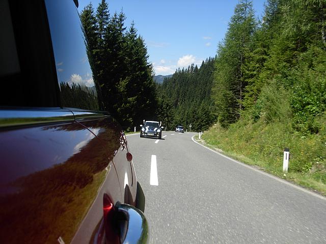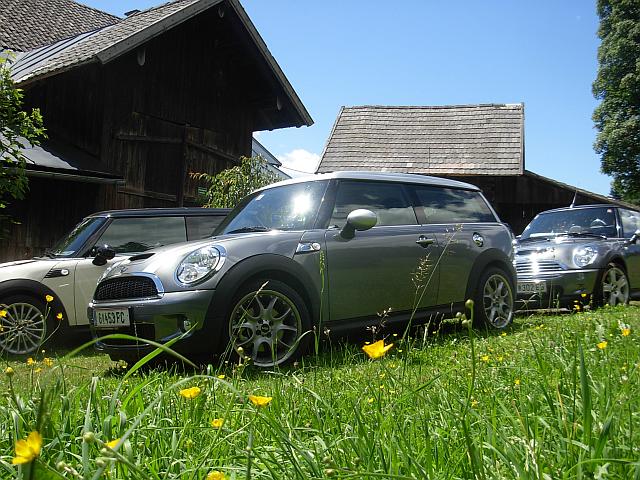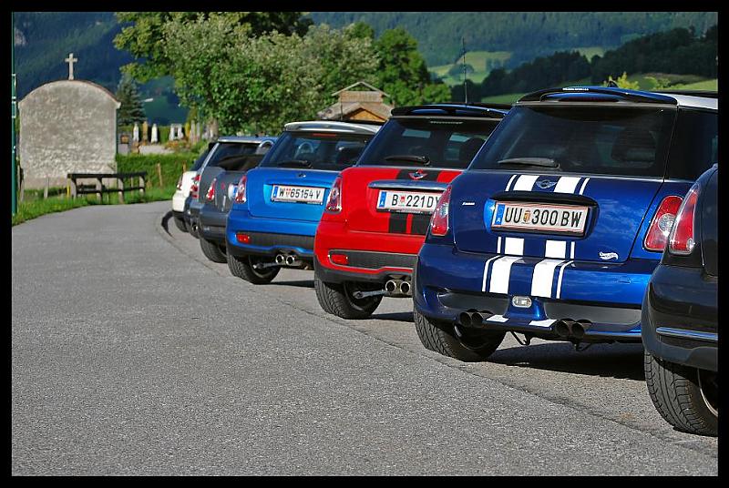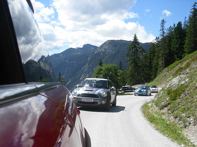 Beim Parkplatz Unterscheffau trafen nach und nach die Teilnehmer ein, trotzdem machten wir vor der ersten Etappe noch eine kurze "Pinkelpause", als plötzlich ein blauer R56 S die Straße entlang gefahren kam und sich zu unseren MINIs gesellte. Nicht nur ich war erstaunt - es war phiscool, der es zwar nicht mehr rechtzeitig zum Treffpunkt schaffte, obwohl wir eh mit Verspätung loscooperten. Glücklicherweise haben ihm freundliche Radfahrer die Richtung gezeigt, "wo die anderen MINIs hin gefahren sind". TotlachenGlück gehabt!