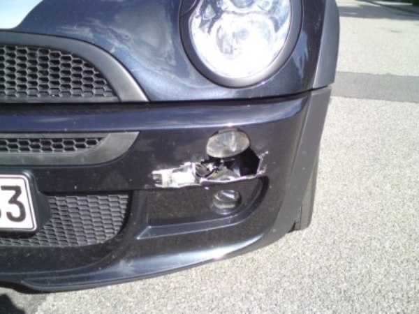 Ein Beton LKW rammte mein Mini vorne rechts und riess dabei die Stoßstange auf Motzen