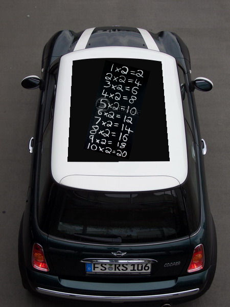 Da ich ja trotz meines hohen Alters, doch noch einen Hang zum Spieltrieb habe, könnte ich mir sogar vorstellen das 1x1 aufs Dach zu kleben. Dafür gibt es auch eine schöne Vorlage und unser Kleiner (mein Sohn) könnte noch was dabei lernen, wenn er Mini fährt.