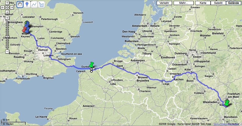 Die Gesamtstrecke nach Silverstone (von DA gerechnet) sind 913 km und etwa 9 Std. zu fahren (grob 5 bis zur Fähre und 4 danach).