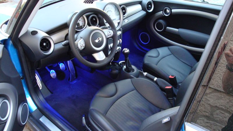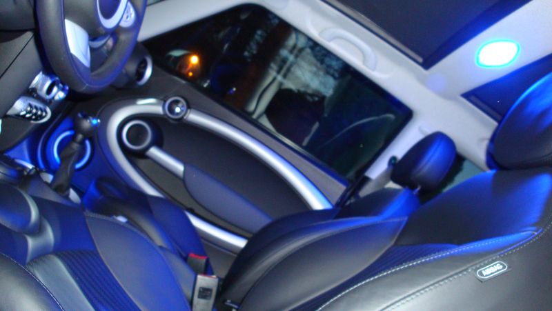 Im Kofferraum habe ich weiße LED Soffitten mit 6 LEDs und im Innenraum eine blaue LED Soffitte mit 8 LEDs. Türbeleuchtung gibts im R53 nicht.
