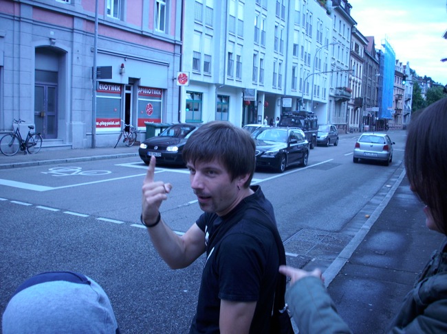 In Freiburg hat der Regen nicht nachgelassen, sodass auch nicht wirklich schöne Bilder von der Stadt (Bsp. das Münster o.ä.) zu sehen sind. Eins hab ich aber noch gefunden - zwar nicht von der Stadt, aber schön *schwärm*. Unser Tourenleiter Blacky belehrend an einer roten Ampel Mein Held!