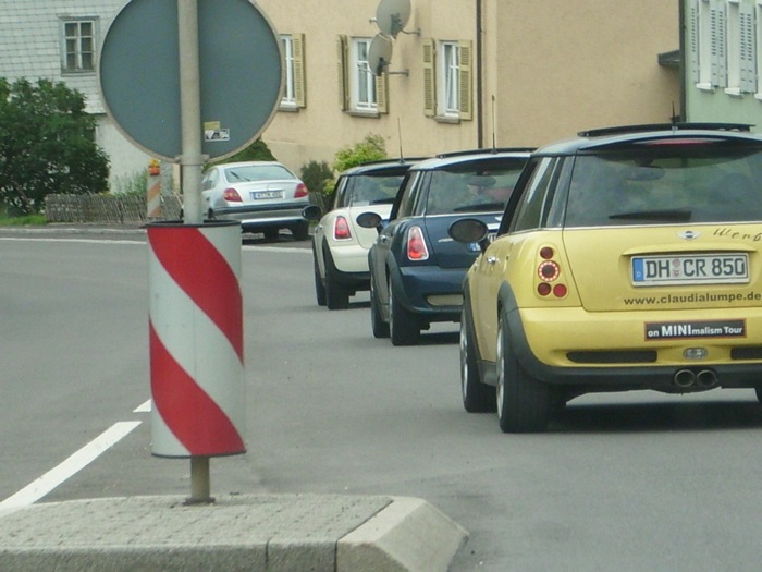 Nach dem wieder einmal reichhaltigen Frühstück hieß es wieder "Aufsatteln" und ab Richtung Friedrichshafen. Natürlich wieder nicht über langweilige Autobahnen, sondern über enge, kurvige Landstraßen mit kleinen Dörfchen und Städtchen, wo 4 MINIs locker für Aufsehen sorgen konnten.