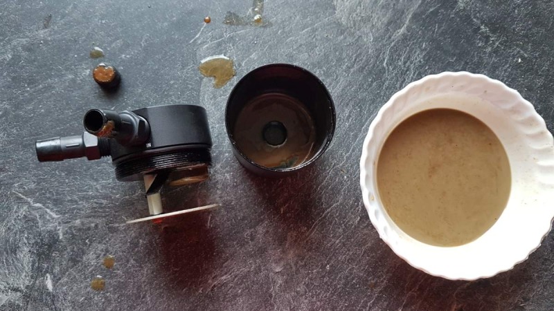Ich hab übrigens am WE die OCC mal geleert und nach circa 8tkm war die nahezu voll! Die Brühe hat richtig ekelhaft nach einer Konzentration aus Benzin und Öl gestunken. Siehe Bild unten. Beim nächsten Mal mache ich das auf jeden Fall nicht in der Küche und ziehe Handschuhe an, die Brühe ist echt richtig widerlich! Die Frage ob ein OCC was bringt stellt sicher daher nicht, dass Ergebnis ist einfach zu offensichtlich! Normalerweise wäre dieser ganze Müll irgendwo zurück im Ansaugtrakt gelandet...