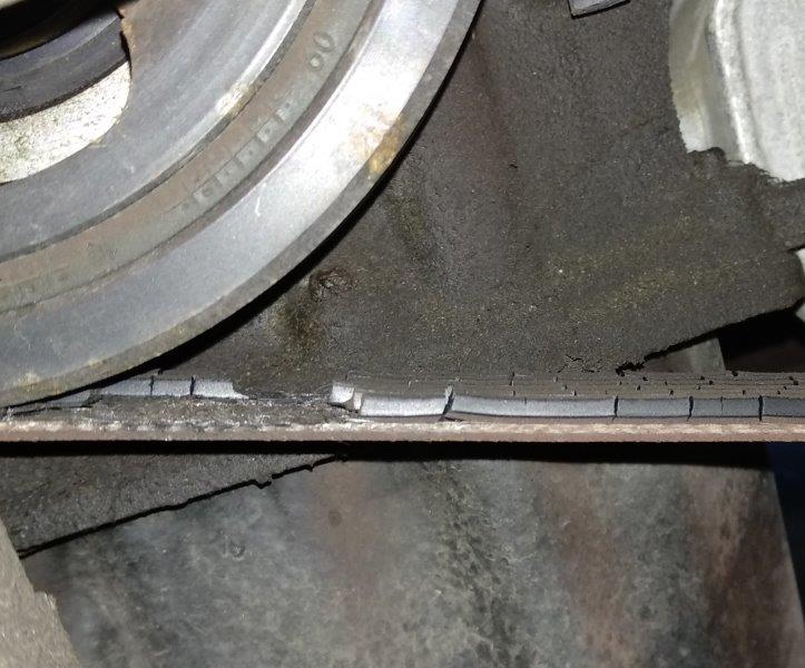 2. Der Riemen sieht (für meine Augen) sehr mitgenommen aus. Die schwarzen Führungsrillen sind komplett spröde und an einer Stelle fehlen sie schon ganz (siehe Foto).
